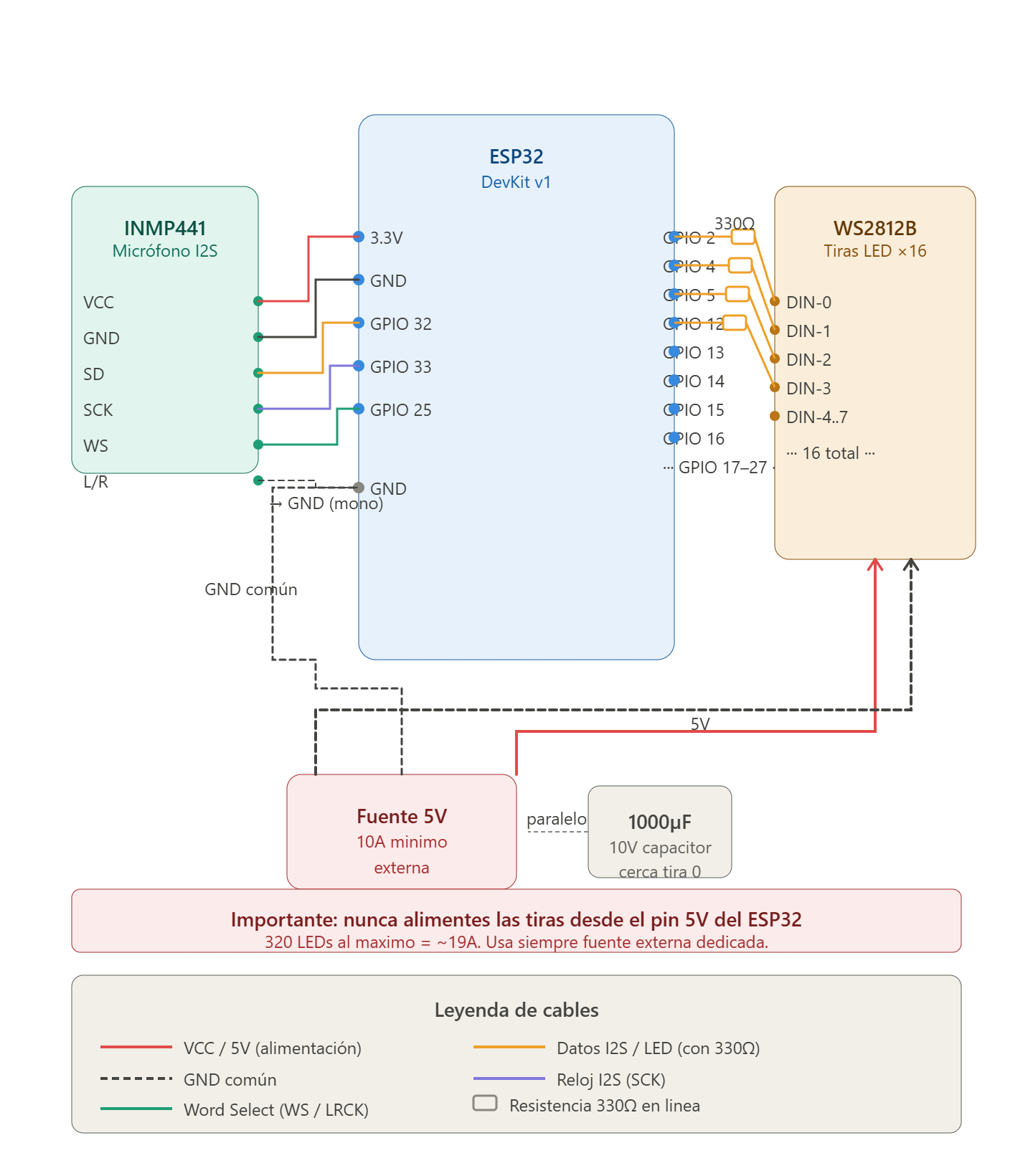Alimentación crítica: Nunca alimentes las tiras desde el pin 5V del ESP32. Usa siempre una fuente externa dedicada de 5V/10A mínimo. El GND de la fuente debe estar conectado al GND del ESP32 (GND común).