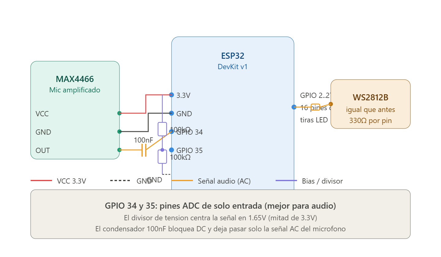 Versión con micrófono analógico MAX4466 o KY-038. Más fácil y barato. Reemplaza los bloques I2S.